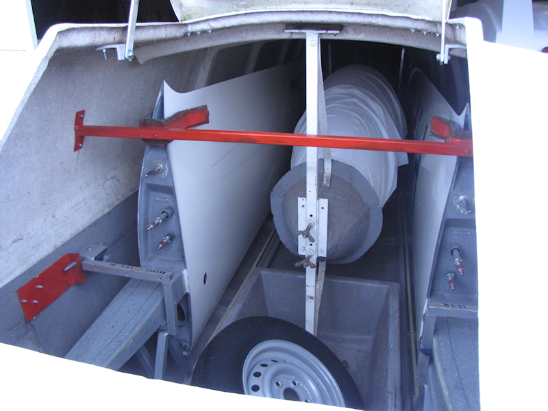 De vleugels en het stabilo kunnen worden gedemonteerd, zodat de delen in een aanhangwagen passen. Hieronder zijn de aansluitingen van rolroeren en remkleppen te zien.