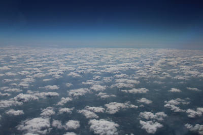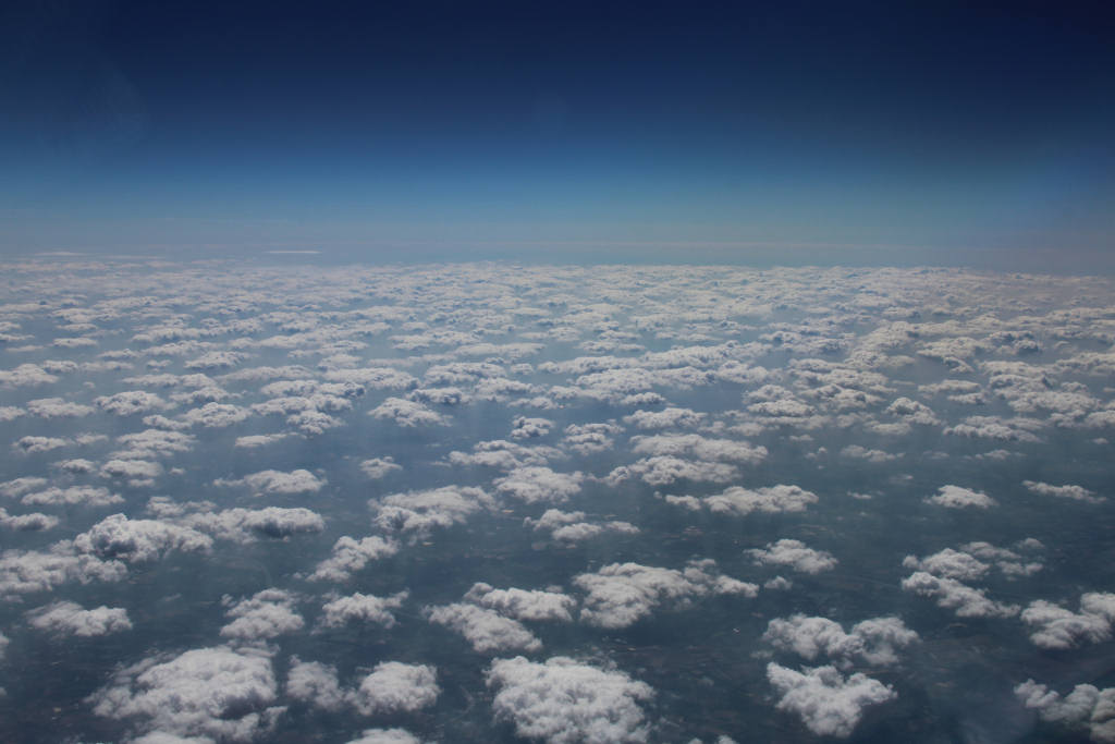 Foto: Cumuluswolken boven Nederland van bovenaf, hier zonder straatvorming